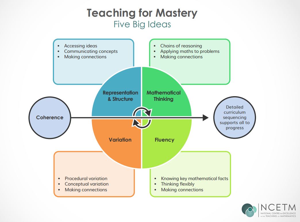 The National Centre of Excellence for Teaching Mathematics (NCETM) breaks down the TfM approach into Five Big Ideas: coherence, representation and structure, fluency, mathematical thinking and variation. Teachers plan for children to experience these ideas in lessons through teacher-student and student-student interactions to develop a deep mathematical understanding.